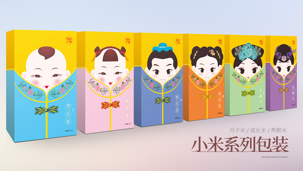 區(qū)別于傳統(tǒng)小米包裝,根據(jù)小米的不同搭配將小米分為月子米,成長米,養(yǎng)顏米3類,視覺上分別以成對的嬰兒、小孩、年輕女性/媽媽為主要形象元素,采用現(xiàn)代插畫的形式創(chuàng)造三組萌趣生動的形象,畫面生動富有張力,配色清醒典雅,增強產(chǎn)品親和力。包裝盒外加設(shè)計有古典服飾圖形的封套,整體形式新穎富有層次感,拆掉封套將呈現(xiàn)另一幅畫面,開盒有趣味,讓整體形成記憶點。